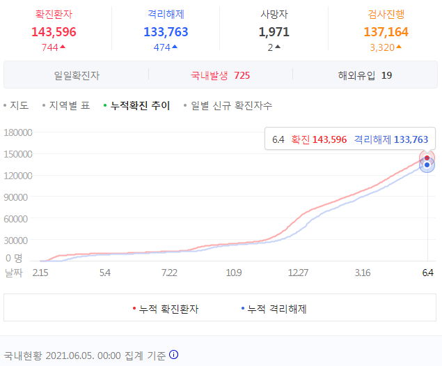 코로나19 집계(2021.6.5. 0시 기준)/:/ 744명 /:/ 집단면역달성 청신호 본문