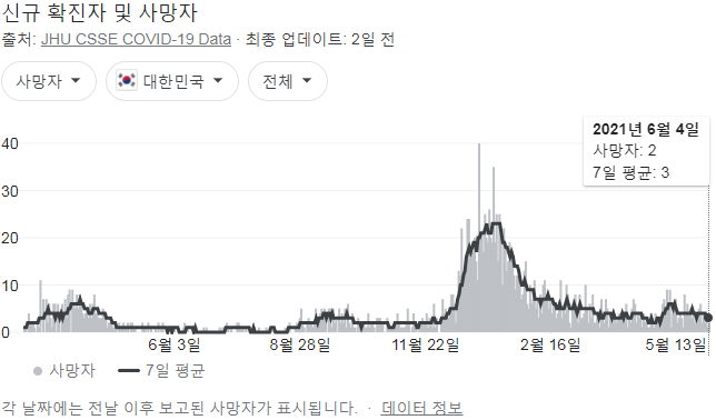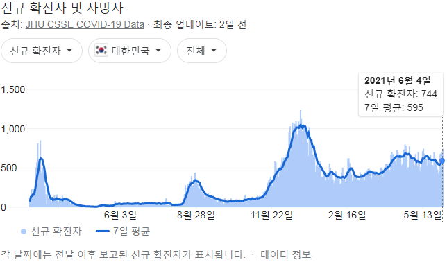 정부 첫 발표는 오전 10시 전후해서 나오고, 그날의 확정발표 보도자료는 오후 2~4시 사이에 나오는 것 같더군요.1 구글 그래프는 미국 날짜가 바뀌는 오후 4~5시 정도에 갱신됩니다.