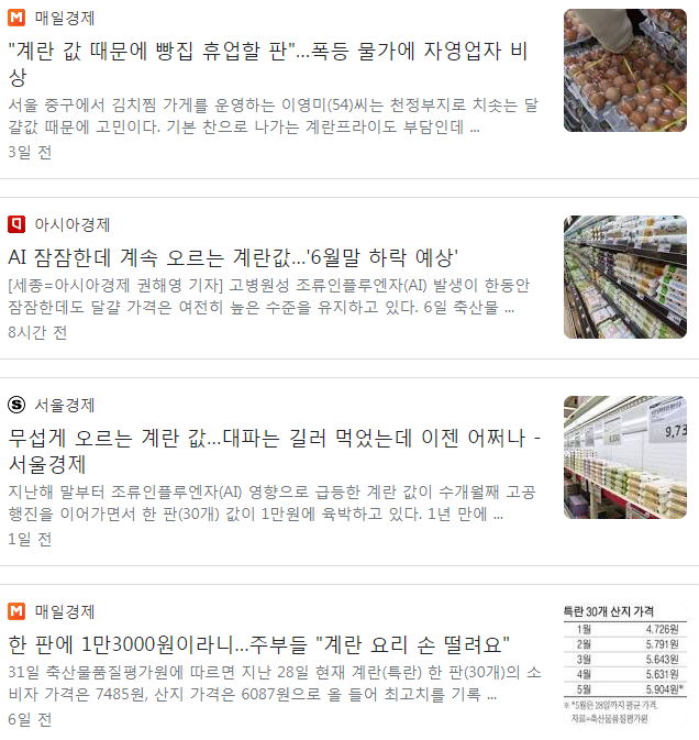 반면, 계란값은 계속 오르고 있네요. 희한하네.. 같은 값으로 치면 계란하고 돼지고기 무게가 비슷하다니..