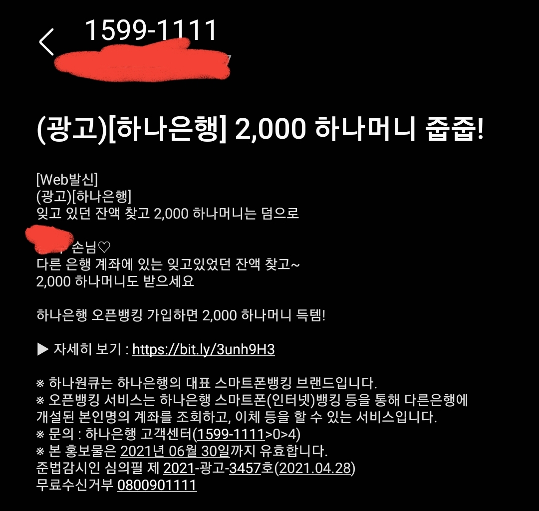 하나은행이 보낸 문자가 맞기는 하겠지만 본문