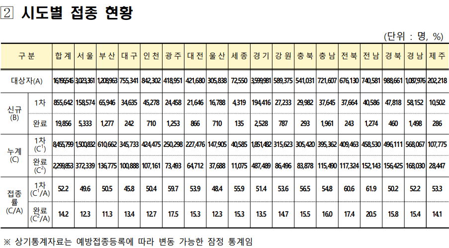 갱신된 시도별 접종 현황.