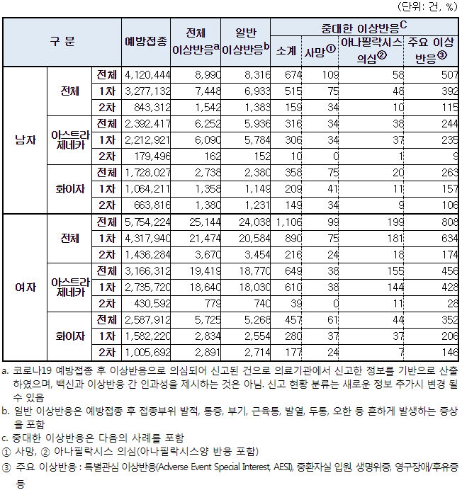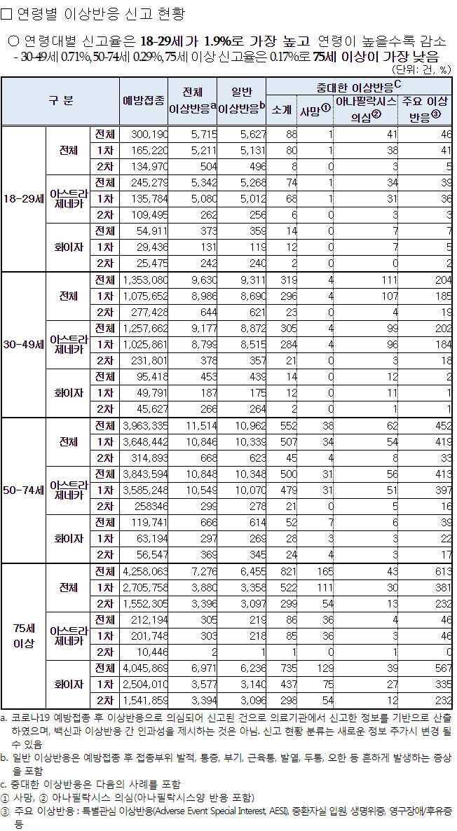 신고자는 젊은층이 많아도, 사망자는 노인층이 많습니다. 중증과 사망에 대한 인과성 심의는 관련없다, 지병이다.. 가 대부분입니다(다른 나라도). 아나필락시스의심 역시 대부분은 불인정.