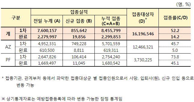 그런데, 이렇게 이해하는 게 맞는거죠? 그러니까, "1차접종"인원은 "접종완료" 인원은 빠진 숫자죠?