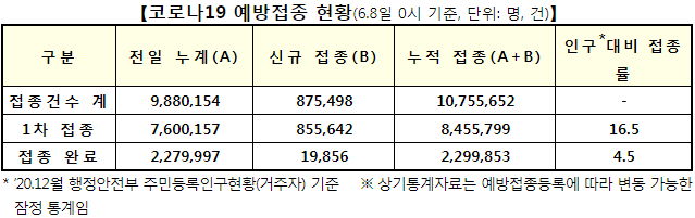 한 번이라도 맞은 사람 1075만 명. 백신 잔고 650만회분.