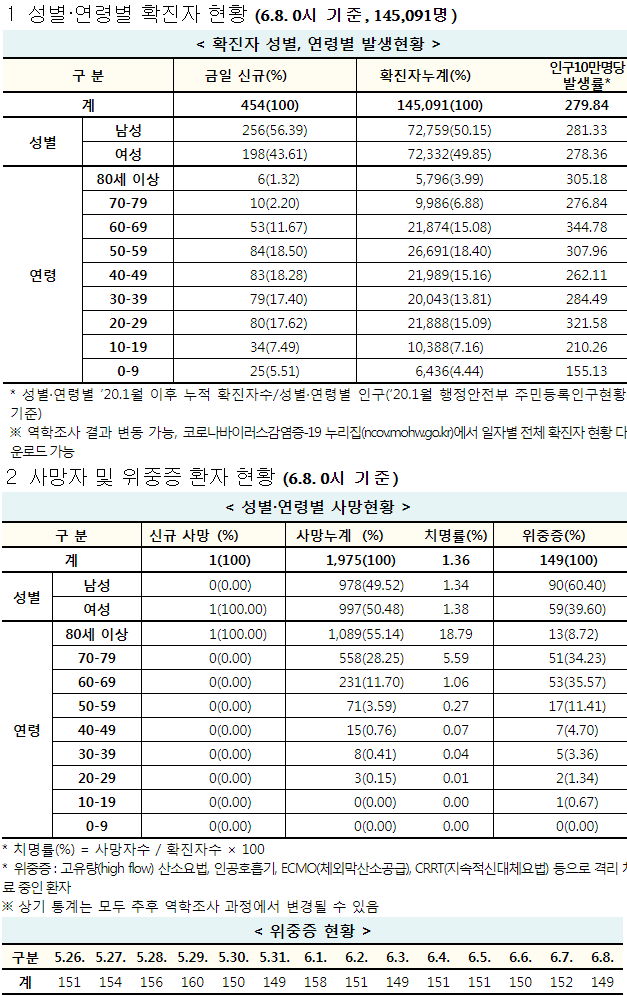 코로나19 집계(2021.6.8. 0시 기준)/:/ 454명/:/ 변이바이러스 현황, 이상반응집계 및 심의결과/:/ 1075만 명 접종. 본문