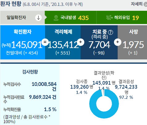 | 코롱나19 집계(2021.6.11. 0시 기준)/:/ 556명/:/ 예방접종 부작용신고집계 없음 (0) | 2021.06.11 |