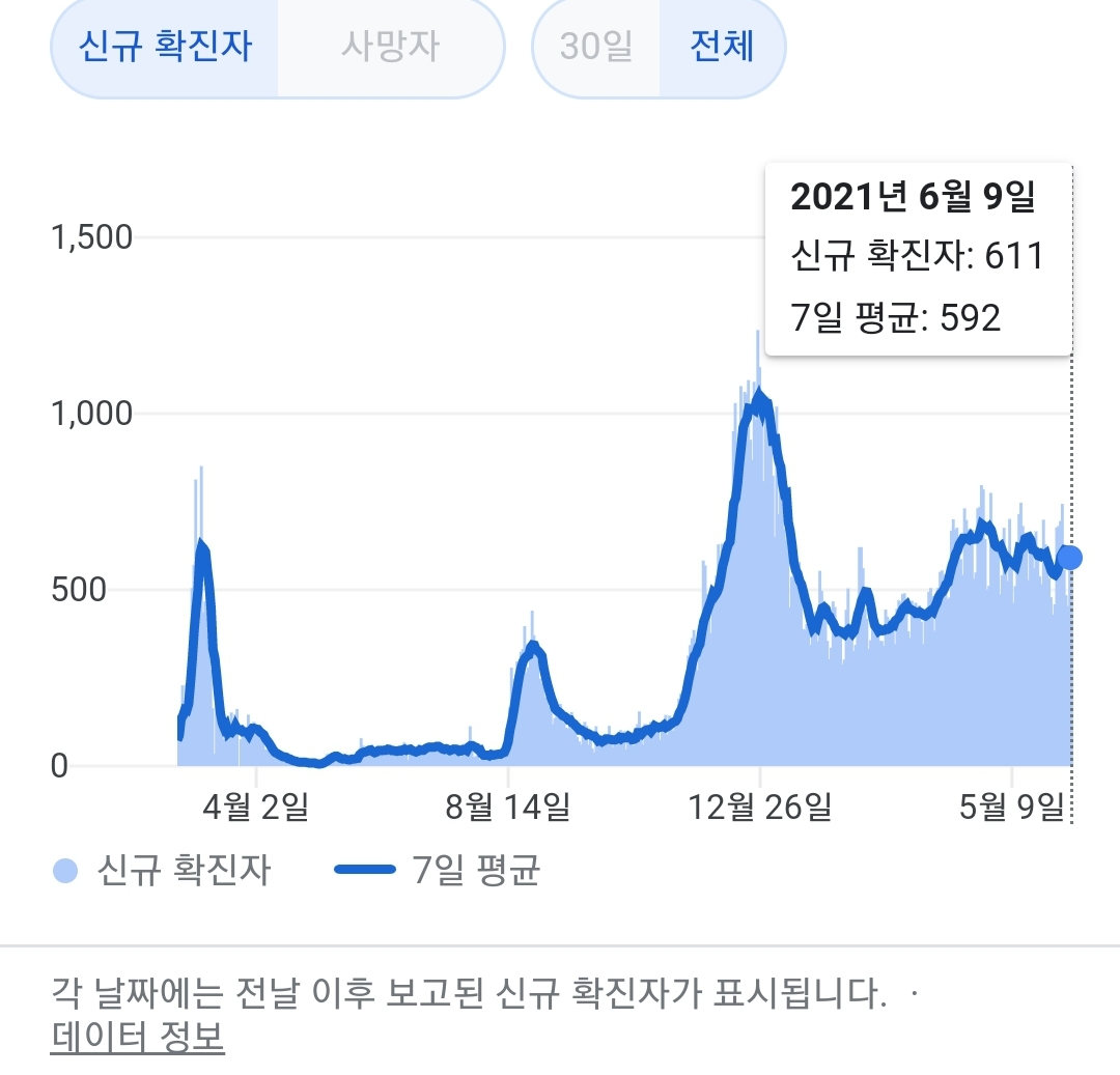 일일 신규확진자수는 연초보다는 줄었지만 그래도 확 늘어난 뉴 노멀이지만