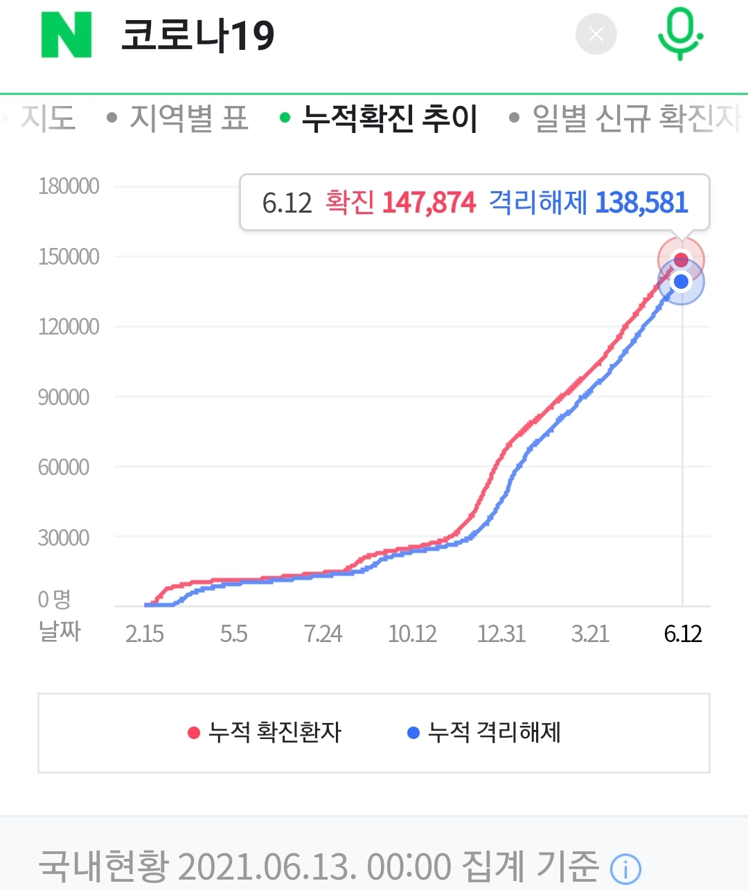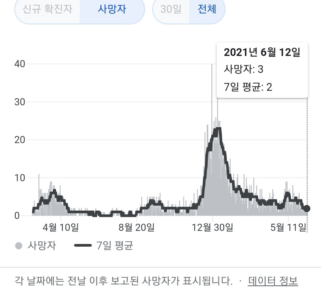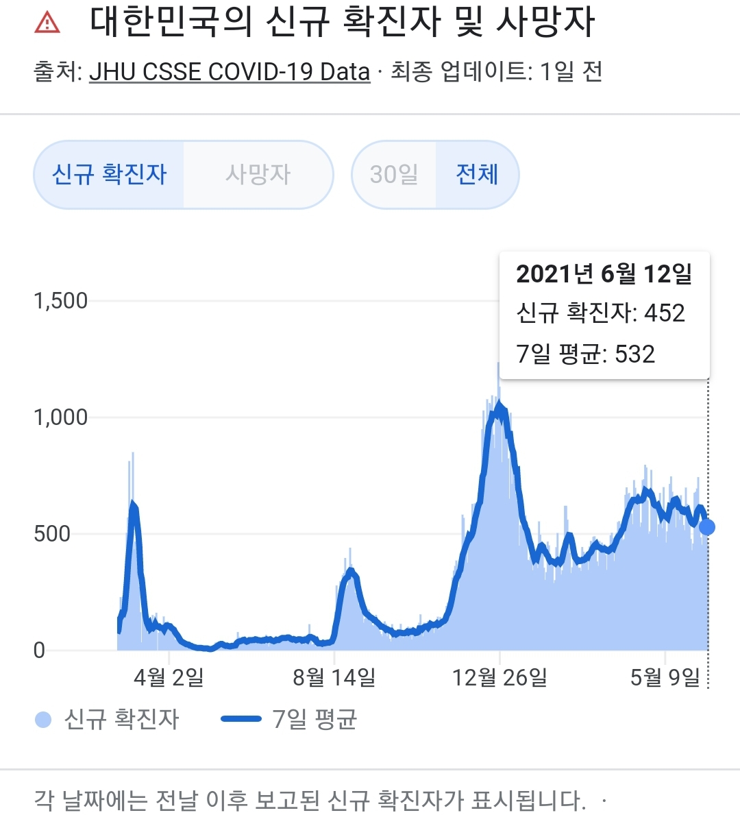 정부 첫 발표는 오전 10시 전후해서 나오고, 그날의 확정발표 보도자료는 오후 2~4시 사이에 나오는 것 같더군요.1 구글 그래프는 미국 날짜가 바뀌는 오후 4~5시 정도에 갱신됩니다.