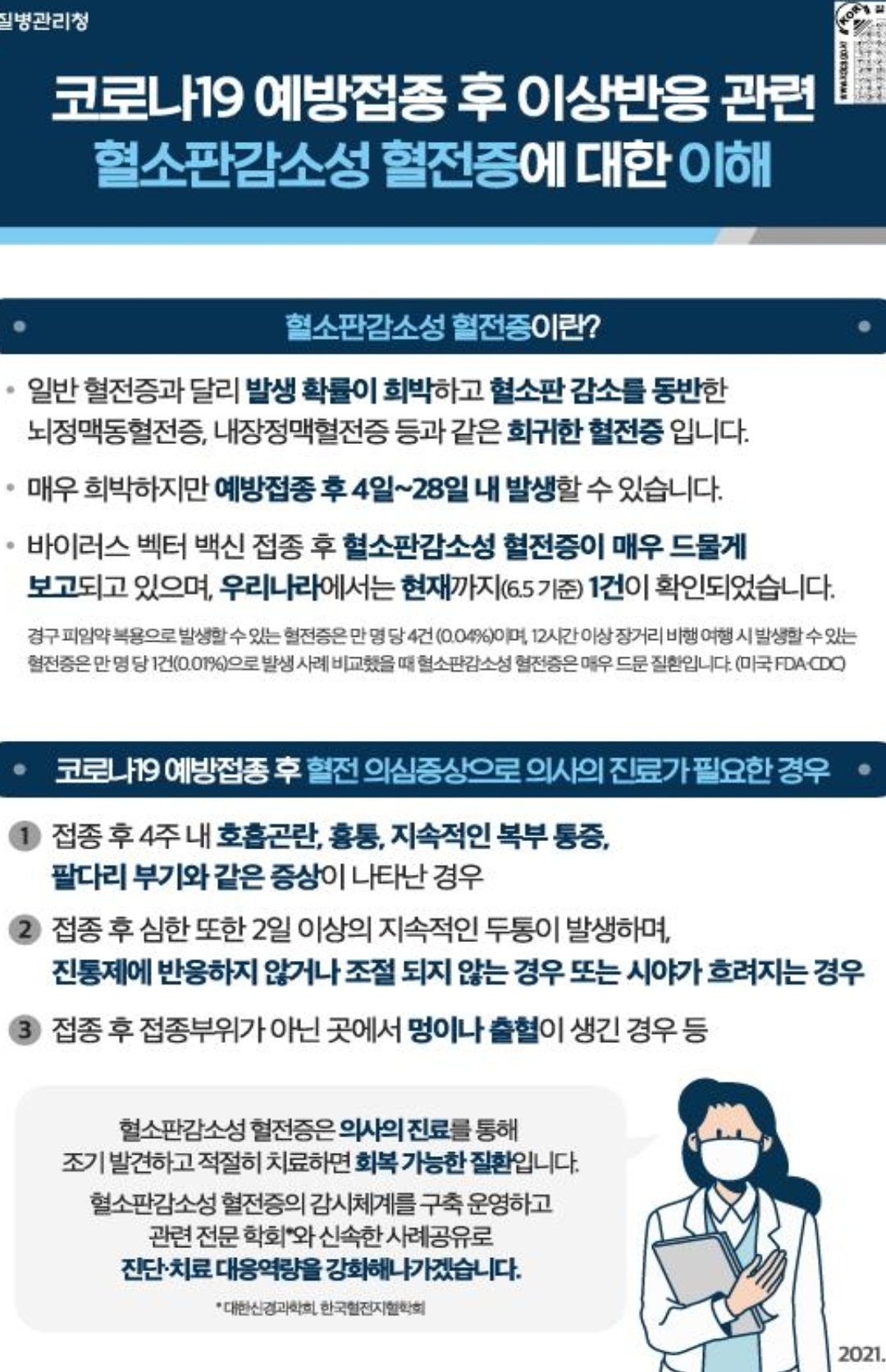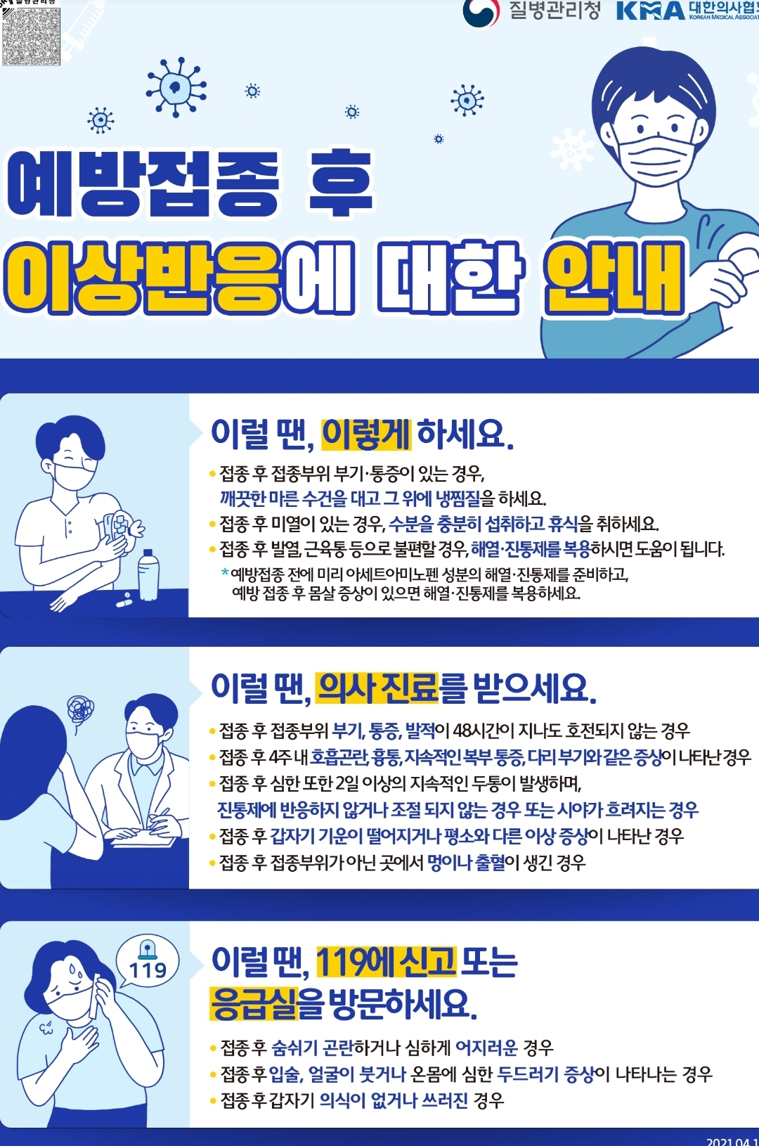 증상이 없는 사람도 많고, 있다면 보통 주사맞고나서 바로 또는 길어야 3일이라지만, 위 홍보물에 나오듯 최대 4주까지는 자기 몸 잘 보라고. 어쨌든 맞는 게 좋으니 피하지 마세요. 맞고 자기 몸 잘 보시라는 말.4