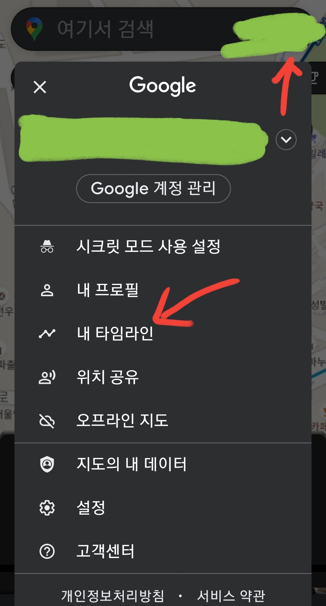 구글지도를 열어, 요즘 구글앱스에서 설정열려면 다 검색창 오른쪽 계정아이콘을 눌러 풀다운메뉴를 호출하죠. 그렇게 해서 "내 타임라인"을 선택.