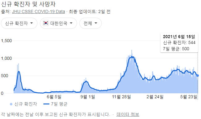 정부 첫 발표는 오전 10시 전후해서 나오고, 그날의 확정발표 보도자료는 오후 2~4시 사이에 나오는 것 같더군요.1 구글 그래프는 미국 날짜가 바뀌는 오후 4~5시 정도에 갱신됩니다.