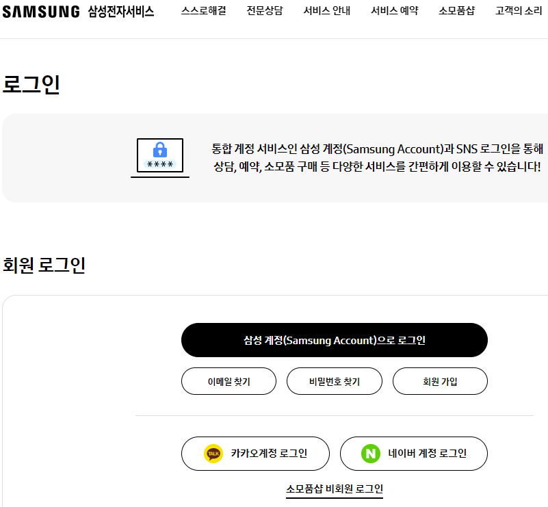 로그인은 삼성계정이나 SNS로그인으로 할 수 있습니다. A/S할 일이 없고 문의할 일이 없으면 삼성계정이 지워지는 것 같더라고요.1 그런데 SNS로그인눌러도 결국은 회원가입창으로 갑니다.