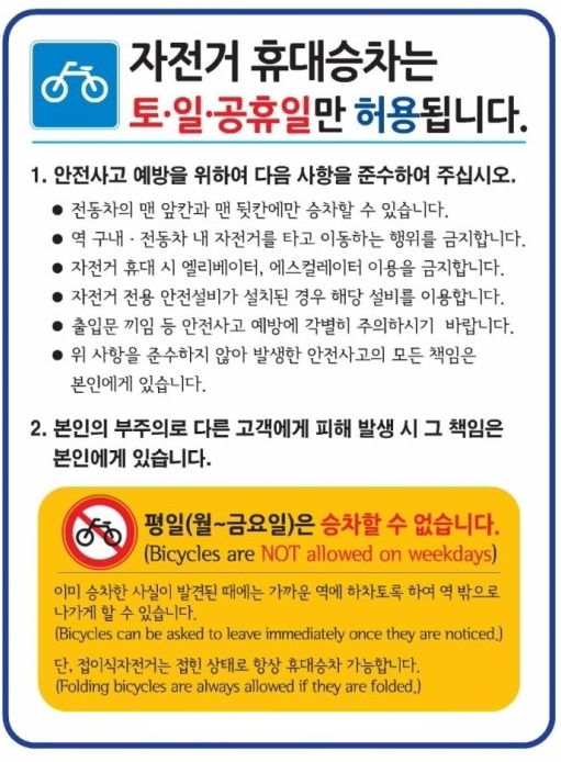 - 일반 자전거는 서울 7호선만 평일 오전 10시~오후 7시 사이 맨 앞뒤칸(좌석없는 칸).