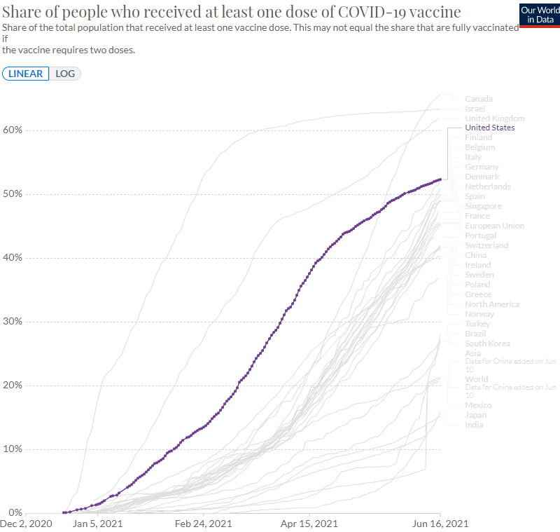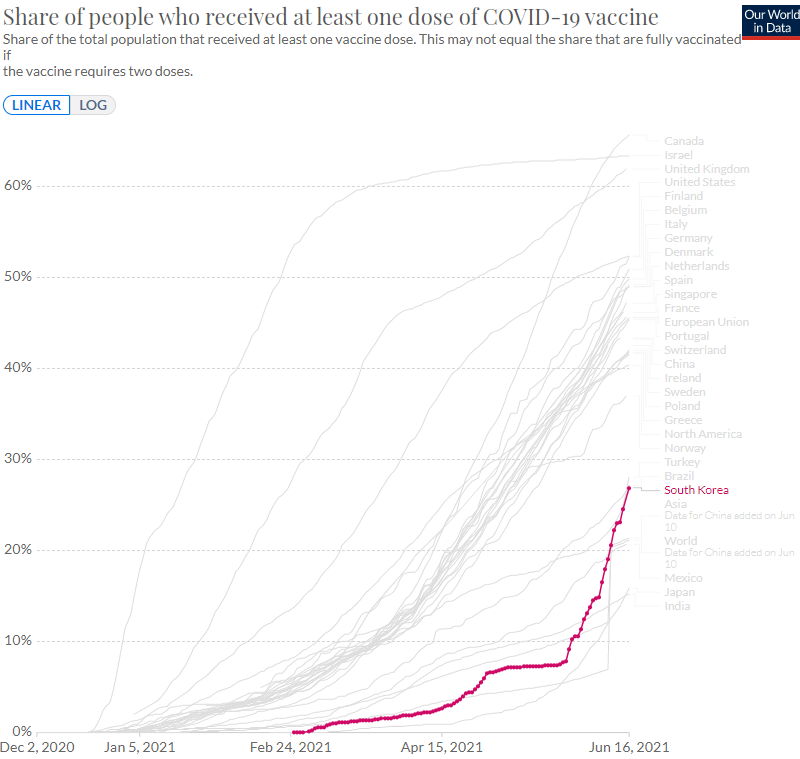 한 번이라도 코로나19 백신맞은 사람 비율/:/ 유럽, 북미, 영국, 미국, 한국, 일본 등 본문
