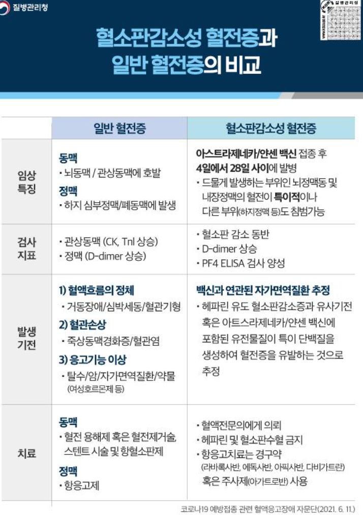 그러나 저 홍보물처럼, 중증 부작용의 경우는 최대 4주까지도 봐야 한다고. 그리고 병원에 갈 정도의 심한 증상이 아니라도 유사한 증상은 있을 수 있으니 주의하라고. 증상의 이름은 혈전이지만 일반 뇌혈관, 심혈관질환의 혈전과 동일한 방식으로 치료하는 것이 아니므로, 만약 두통이나 관련 증상으로 병원갔다면, AZ백신/얀센백신을 맞은 적 있다면 반드시 의사에게 이야기해야 합니다.