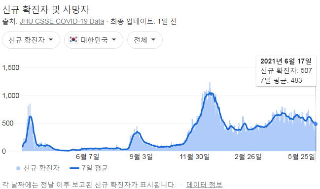 정부 첫 발표는 오전 10시 전후해서 나오고, 그날의 확정발표 보도자료는 오후 2~4시 사이에 나오는 것 같더군요.1 구글 그래프는 미국 날짜가 바뀌는 오후 4~5시 정도에 갱신됩니다.