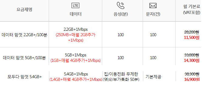 * 저 회사의 요금제표에도 400kbps QoS를 주면서 음성/문자 무제한이나 기본제공량이 있는 요금제는 더 싼 것들이 있습니다.