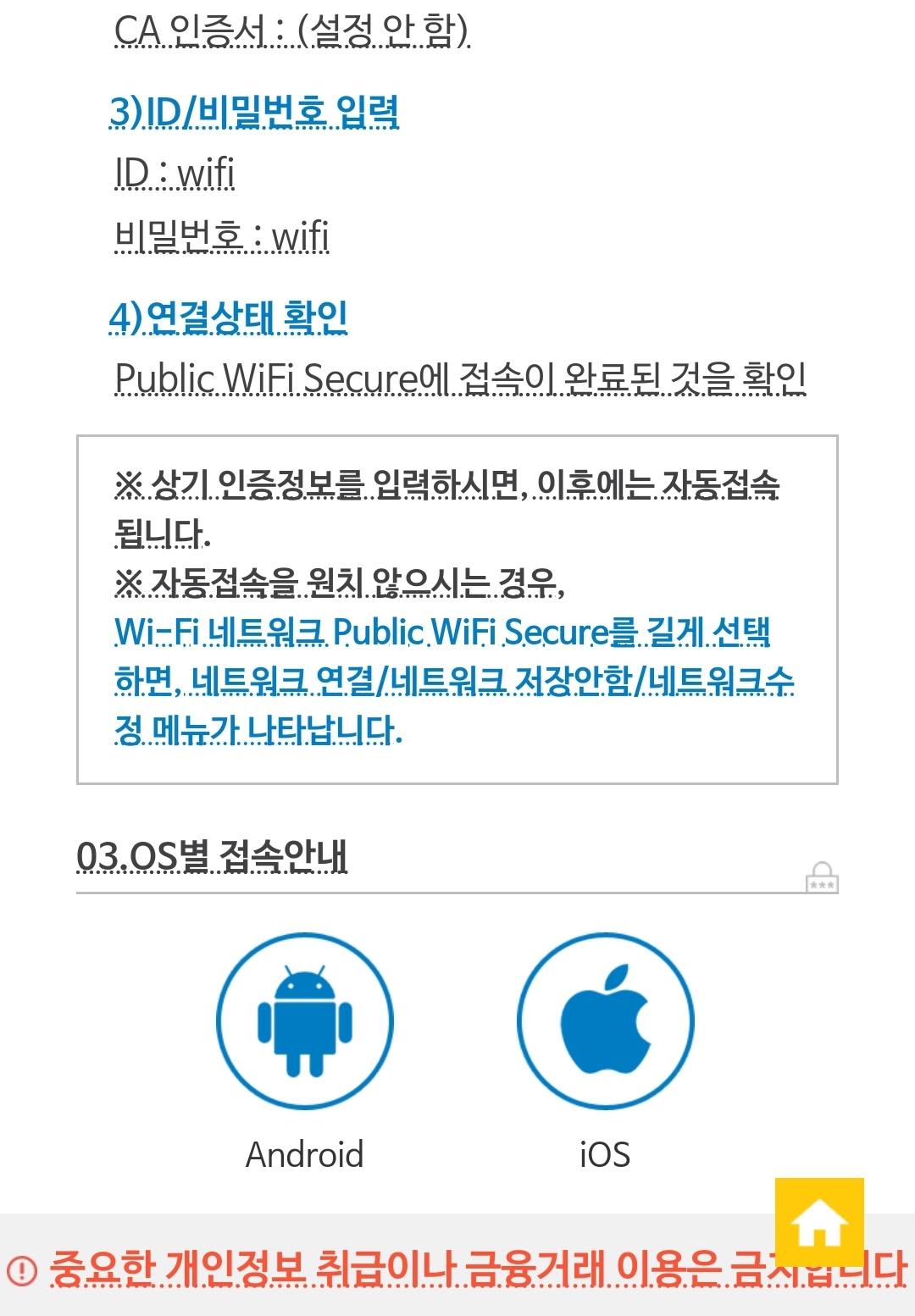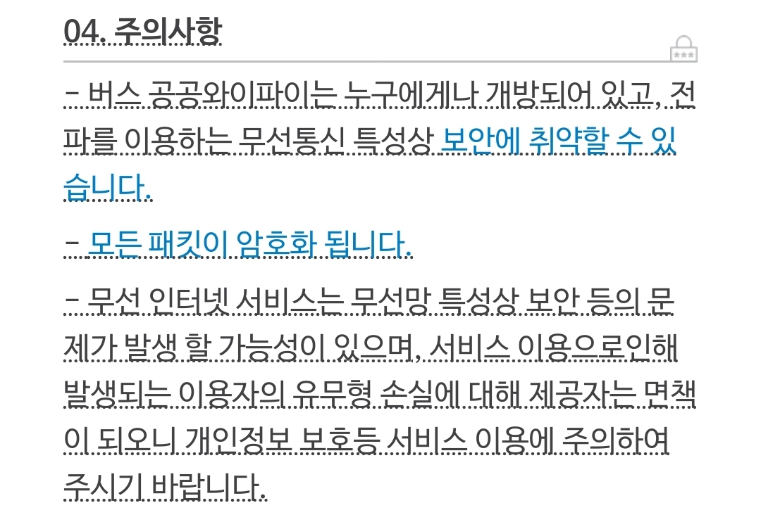 즉, "우리 나름대로 신경썼다. 그러니 공공와이파이를 편리하게 이용해라. 하지만 한계가 있으니 해킹당하면 삶이 힘들어지는 중요한 업무처리는 하지 마라"는 면책공지.