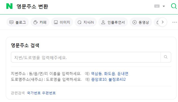 그냥 네이버 검색창에 "영문주소"라고만 쳐도 변환페이지가 나옵니다.