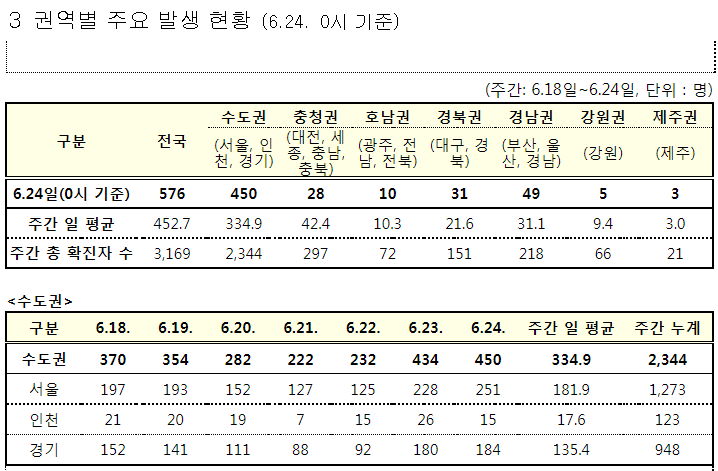 수도권(서울 경기 인천)은 452명 (지역인구 2592.6만 명)