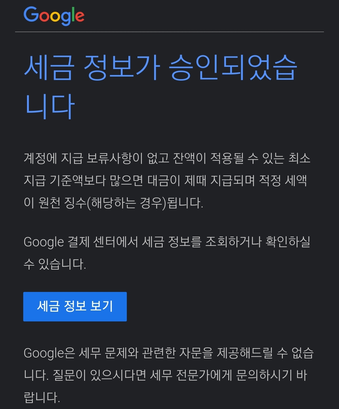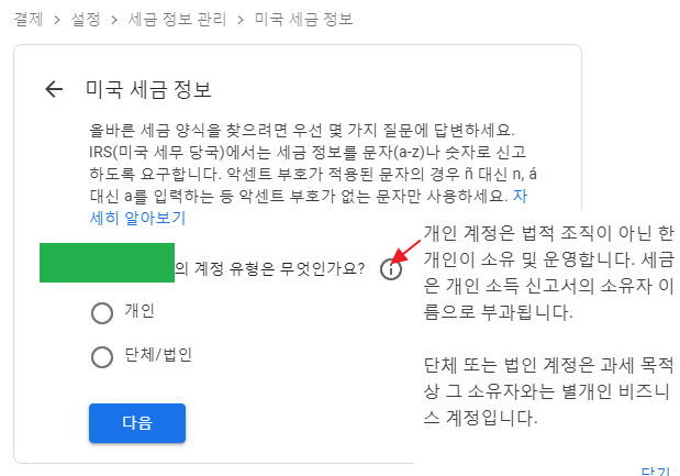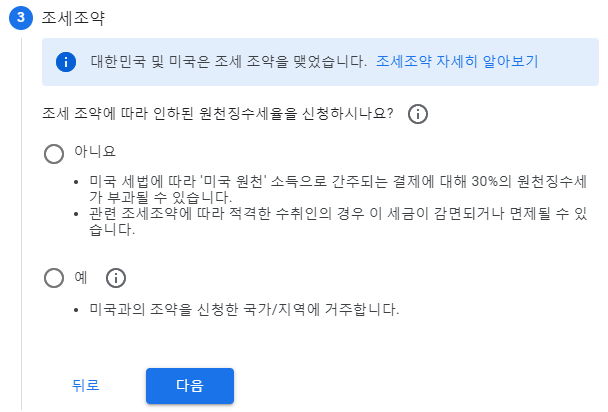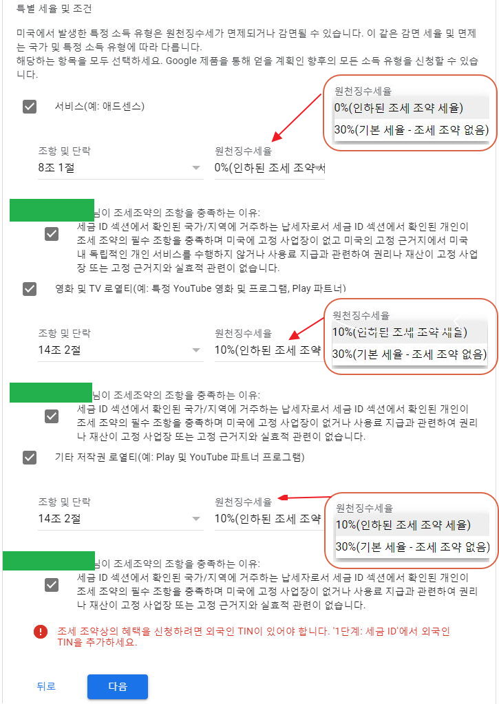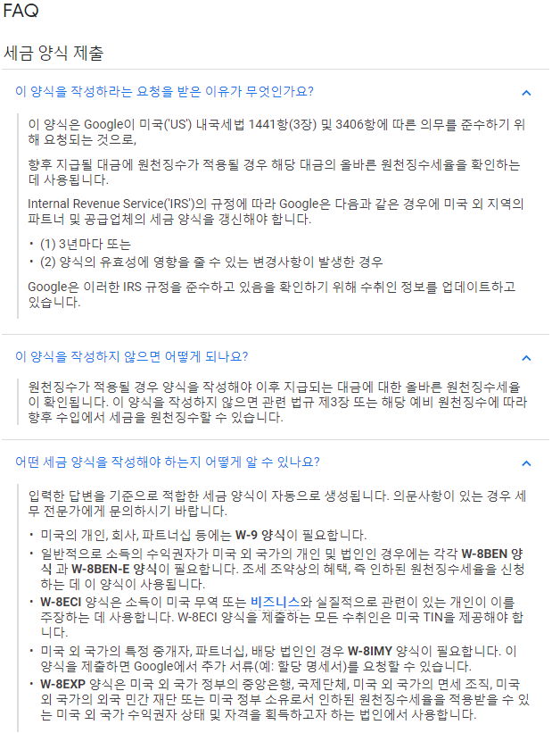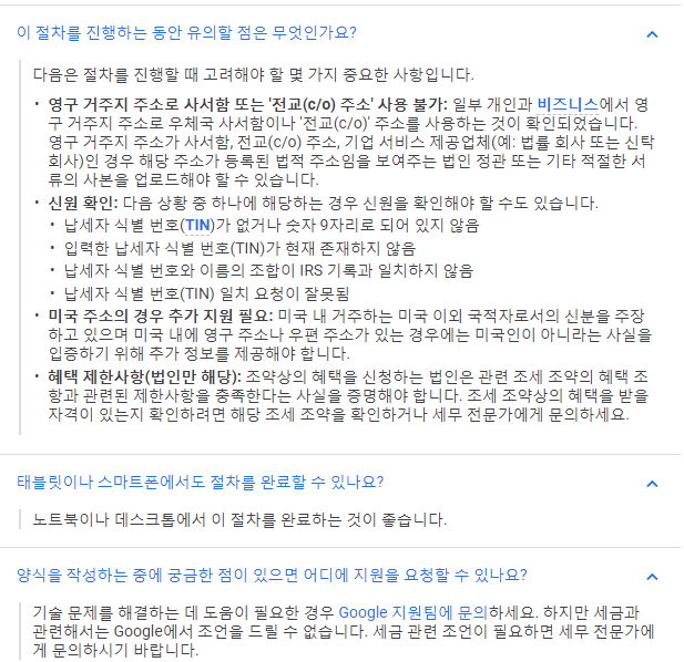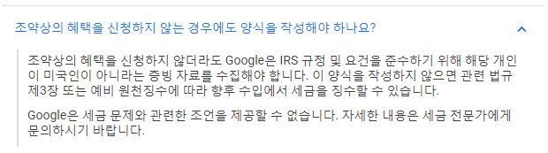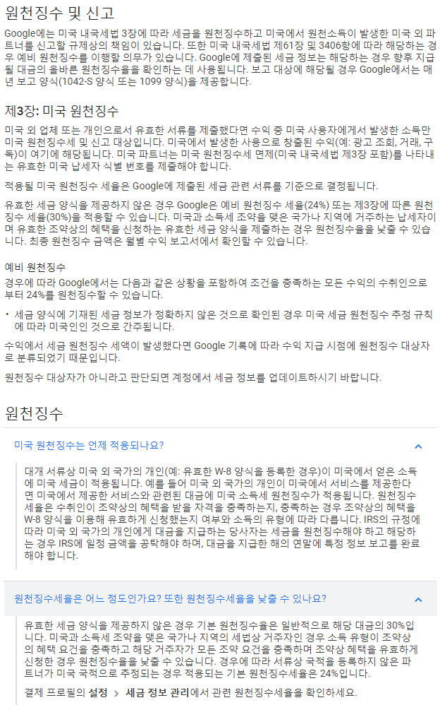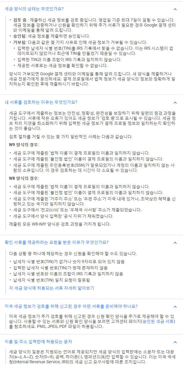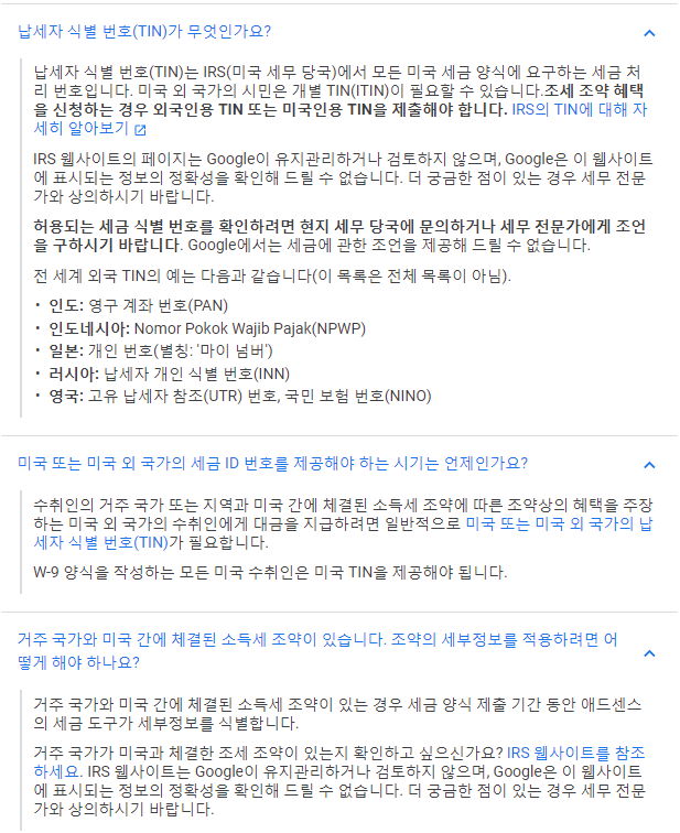 어디 글을 읽어보니 개인이라도 제대로 처리하려면 미국 국세청에 납세자식별번호1라는 것을 받아야 한다는데, 그건 몇 달 걸린다고 합니다. 그래서 안 받은 사람은 TIN 번호없는 방식(세율이 훨씬 높습니다)으로 접수하고, 나중에 갱신해줘야 할 것 같은데, 갱신방법은 모르겠어서 그렇게 해도 될지도 잘 모르겠습니다. 그리고 그 번호를 받는 건 구글이 처리하는 게 아니라 미국 국세청쪽 업무(우편접수)라고.