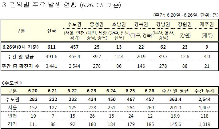 수도권(서울 경기 인천)은 463명 (지역인구 2592.6만 명)