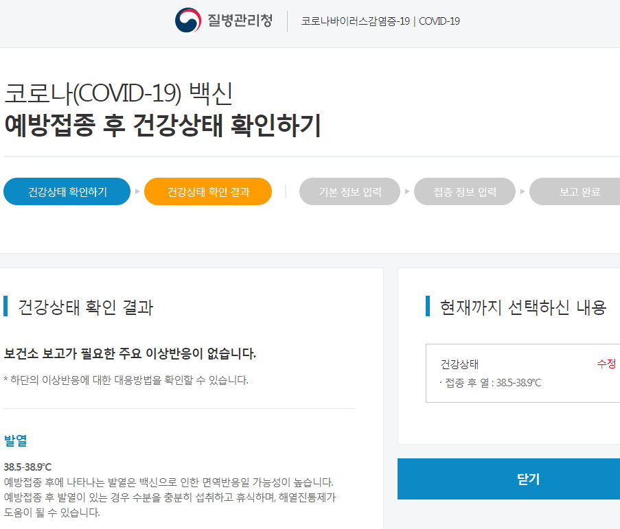 (예를 들어, 위 스크린샷처럼 섭씨 39도 미만의 열은 '정상적인 면역형성과정'으로 취급되며, 보건소에 신고접수할 이상반응증상으로 취급되지 않습니다. 해열제드시고 안정하시거나 가까운 의원에 가서 예방접종맞은 사실을 밝히고 외래 진료받아보시라는 것이 권장 대응책입니다)