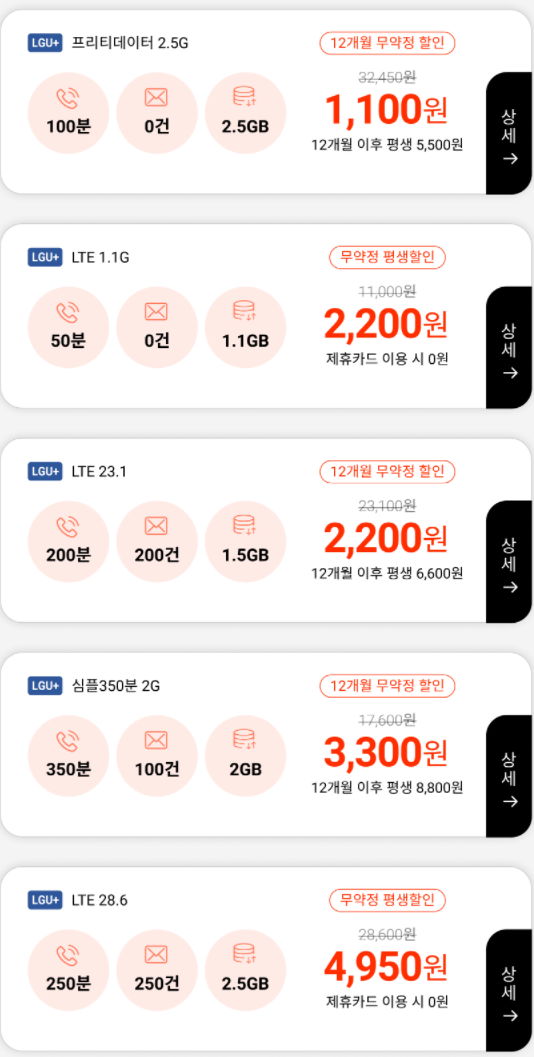 초저가요금제는 기본제공문자가 없다거나, 기본제공문자가 SMS만 포함하고 LMS는 2건으로 친다든가 사진 MMS는 기본제공이 아니라든가 등 조건이 붙은 데가 있습니다. 물론, 통신사나 요금제따라 천차만별이라서 SMS/LMS/MMS모두 기본제공문자 1건으로 치는 요금제도 있을 겁니다. 그리고 대부분이 6개월, 8개월, 12개월 등 할인을 몇 달 적용한 다음에 인상된 요금을 적용합니다. (요즘은 알뜰폰 통신사 대부분이 이런 식으로 행사를 합니다)