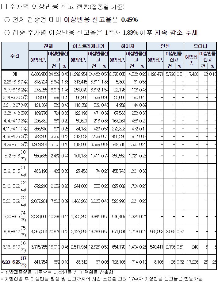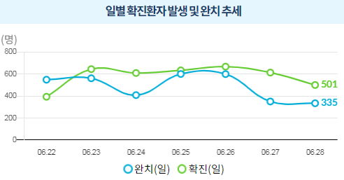 코로나19 집계(2021.6.28. 0시 기준)/:/ 주말에 500명 남짓으로 다시 줄었습니다./:/ 이상반응과 심의결과통계가 발표된 날 본문