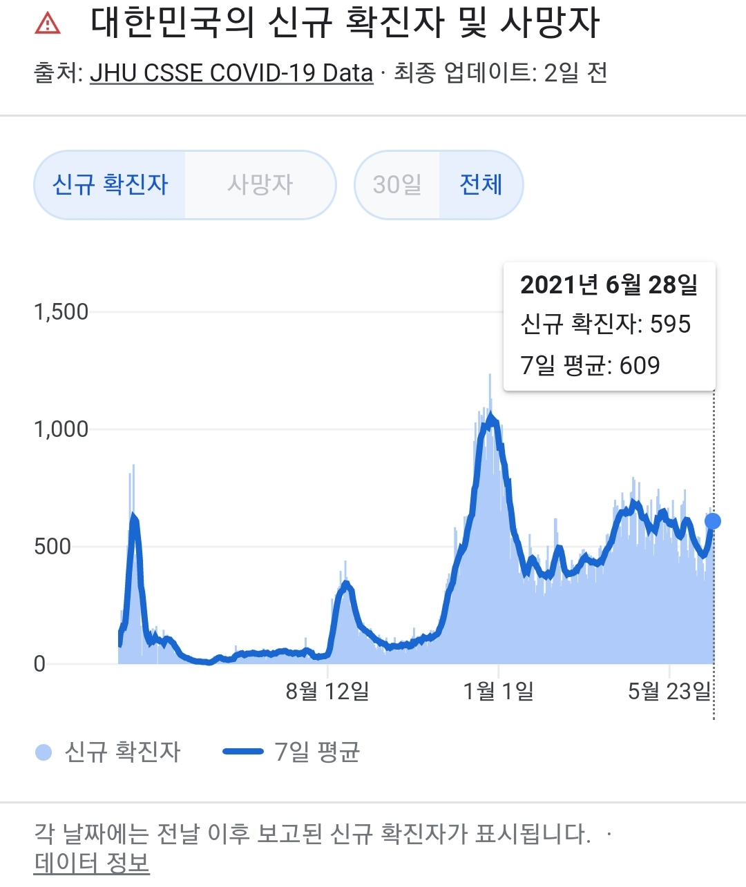 | 코로나19 집계(2021.6.28. 0시 기준)/:/ 주말에 500명 남짓으로 다시 줄었습니다./:/ 이상반응과 심의결과통계가 발표된 날 (0) | 2021.06.29 |