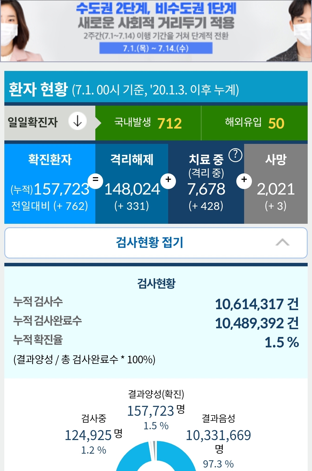 코로나19 집계(2021.7.1. 0시 기준)/:/ 762명 중 수도권이 609명 본문