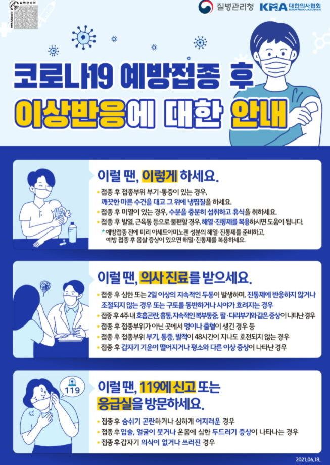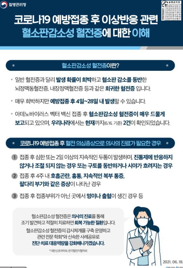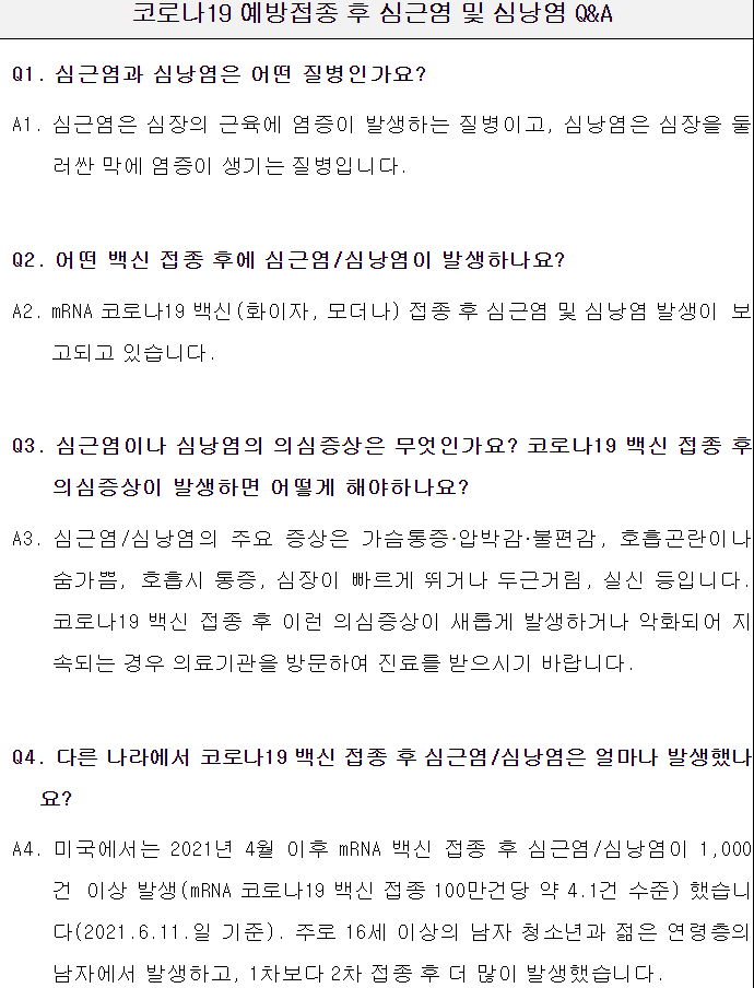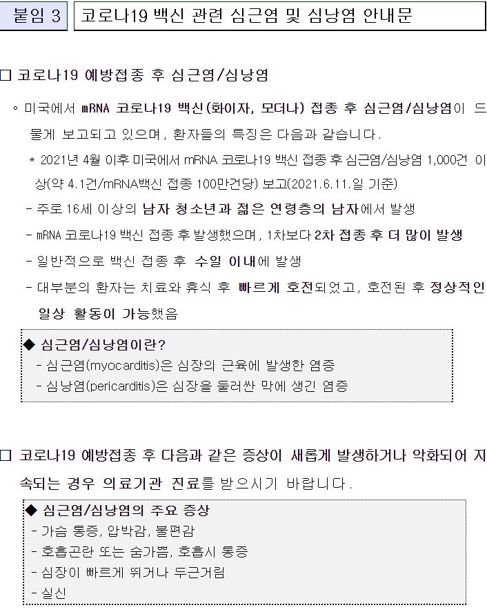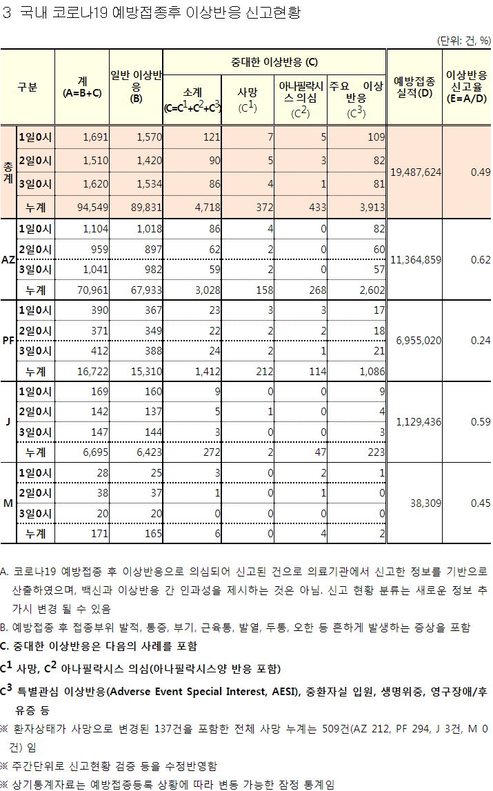 이상반응(부작용)집계와, 극히 드문 중증부작용(혈전, 심근염) 안내.
