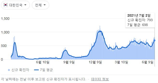 작년 어느 단체도 이랬는데.. 인과관계는 모르겠지만 '까마귀날자 배떨어진' 격으로, 그 다음이 작년 확진자그래프의 여름 볼록이었습니다.