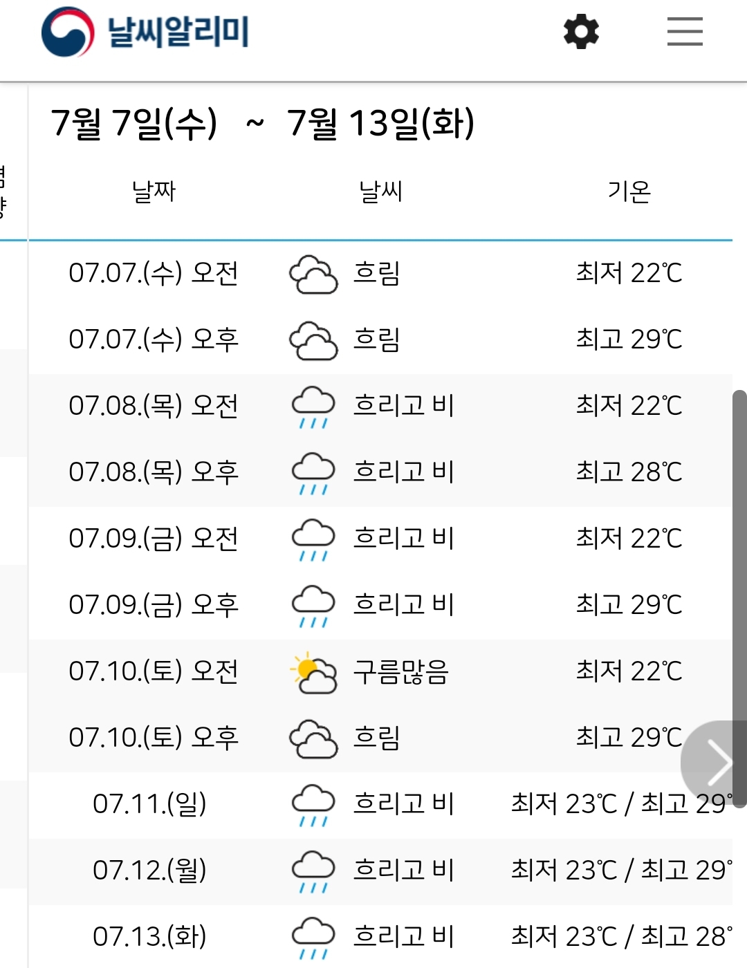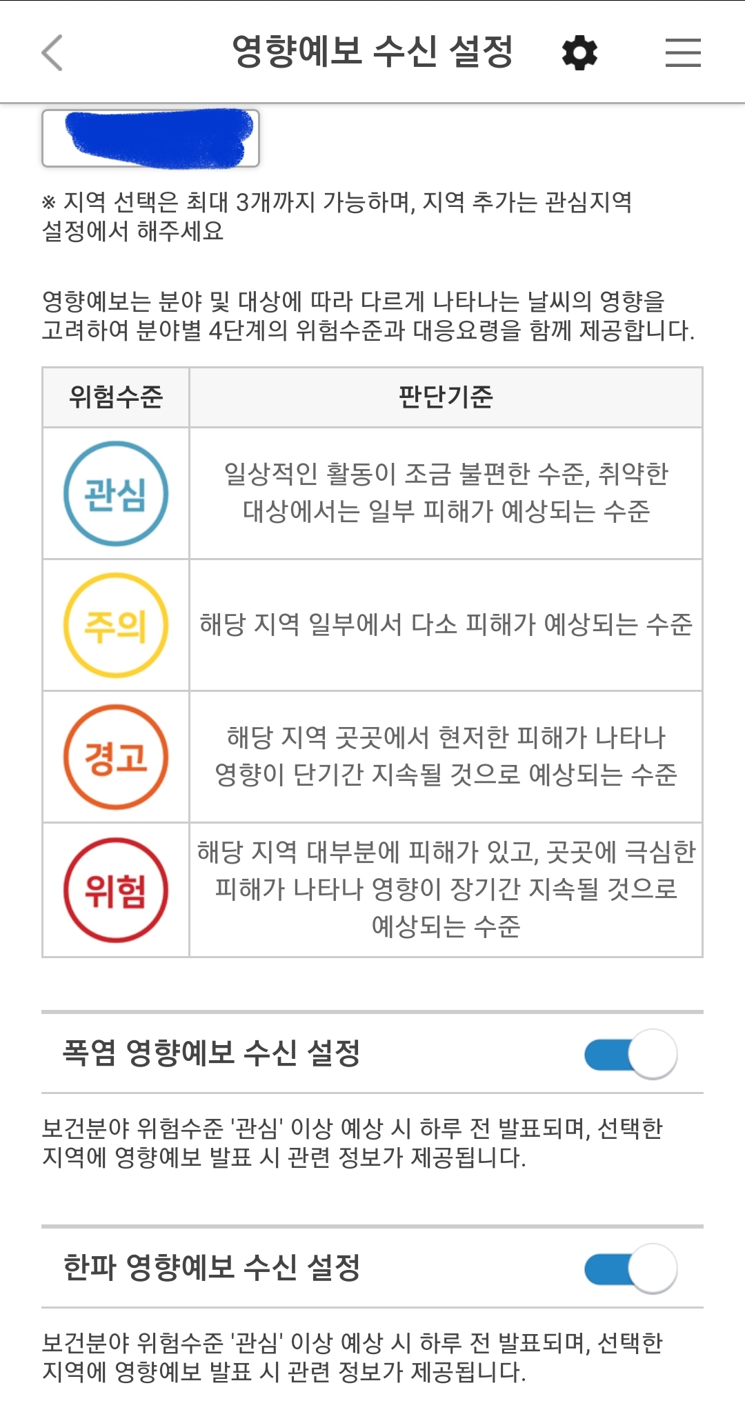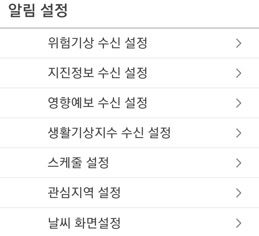 비가 주룩주룩 오네요. 어제는 장맛비다웠습니다./:/ 기상청 날씨알리미앱 알림설정화면 본문