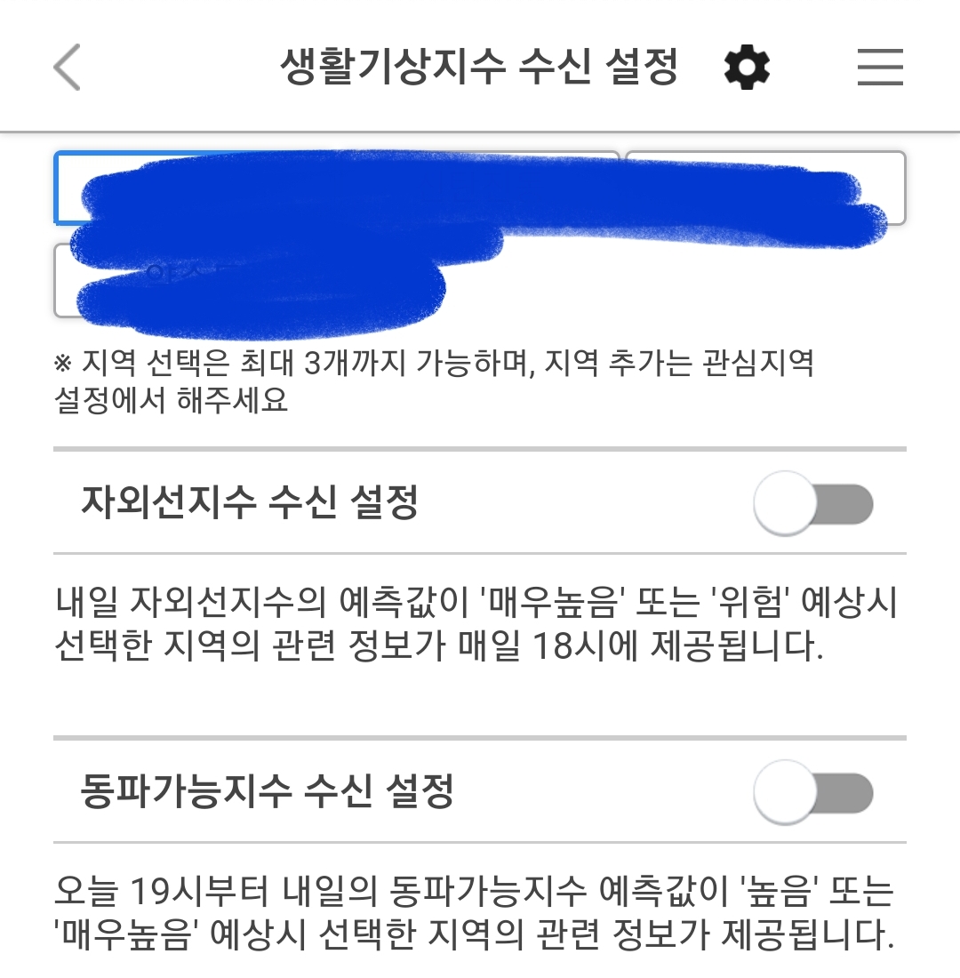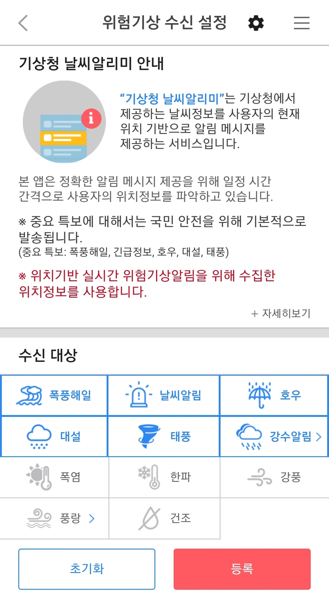 ※ 기상청 날씨알리미앱 알림설정화면