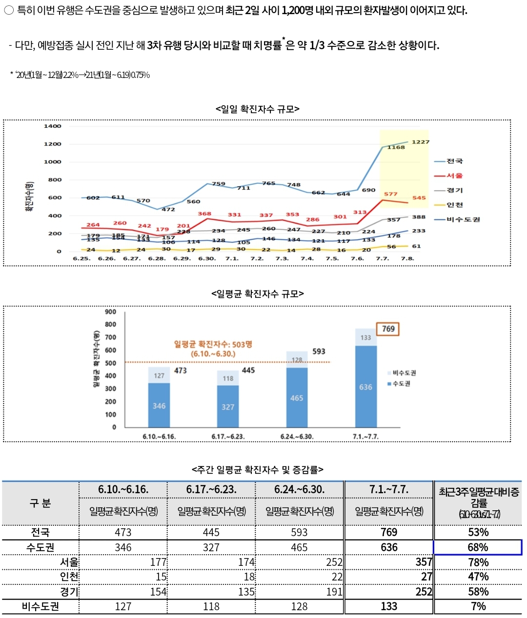 네 번째 유행 진입, 이전 3주 대비 확진자 53% 증가(7.8., 정례브리핑)