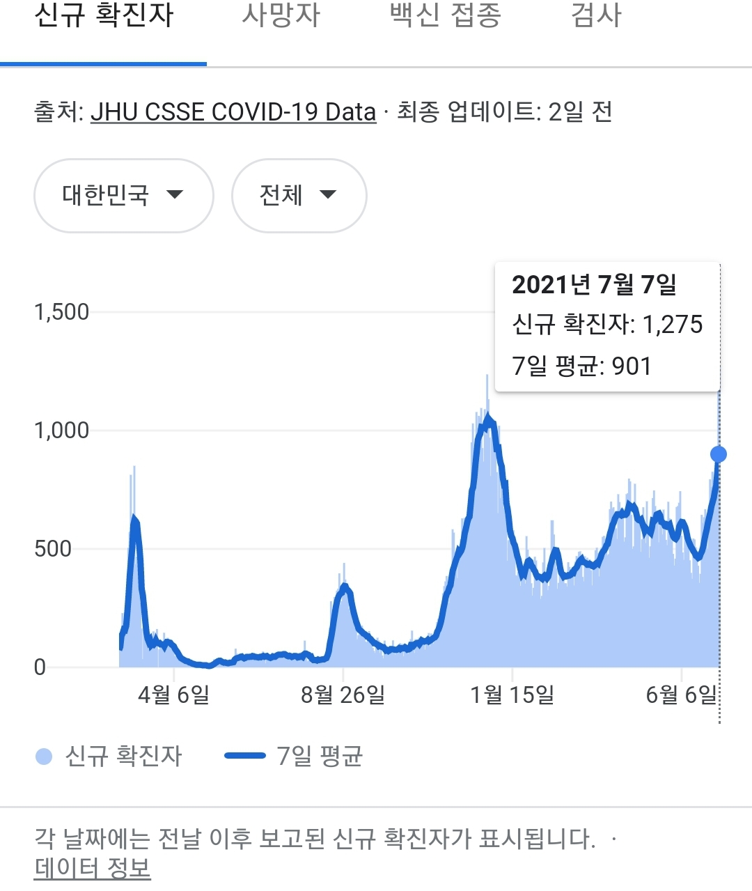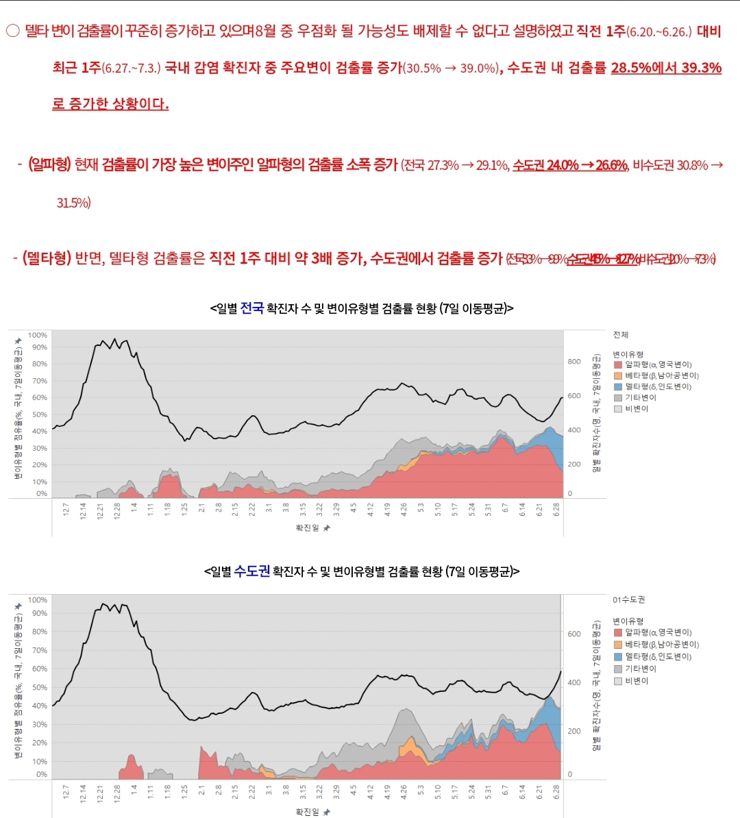 코로나19 집계(2021.7.8. 0시기준)/:/ 1275명/:/ 정부, 4차유행 언급/:/얼마 안 가 델타변이가 알파변이를 넘어설듯 본문