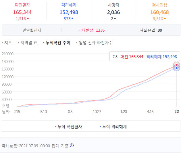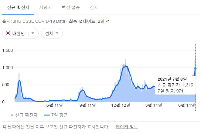 코로나19 집계(2021.7.9. 0시기준)/:/ 1316명/:/ 수도권 새 거리두기 4단계 발표(~7.25) 본문