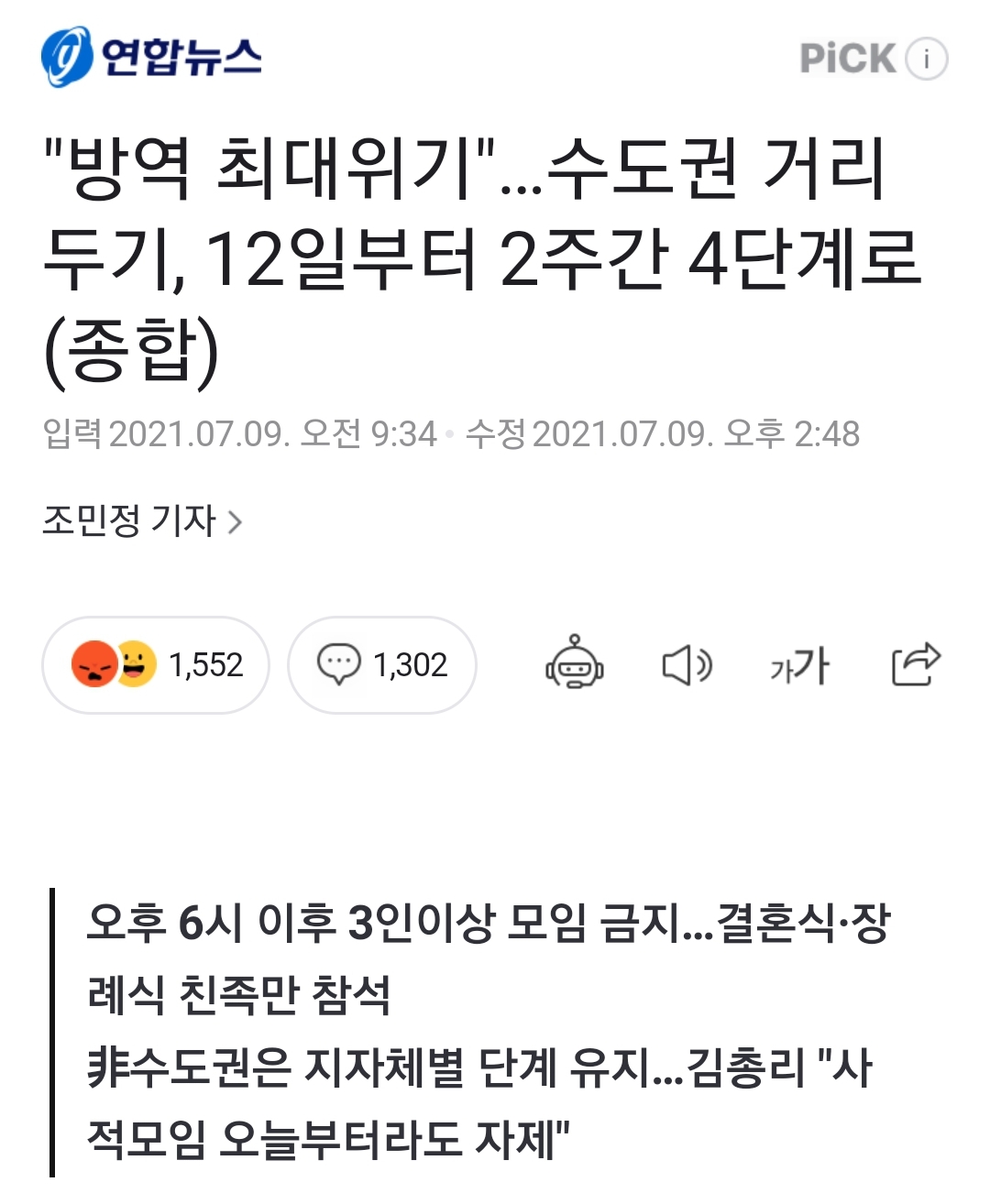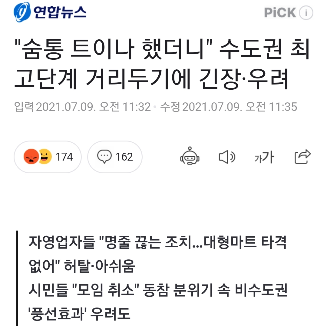 "수도권" 거리두기 4단계 보도기사.
