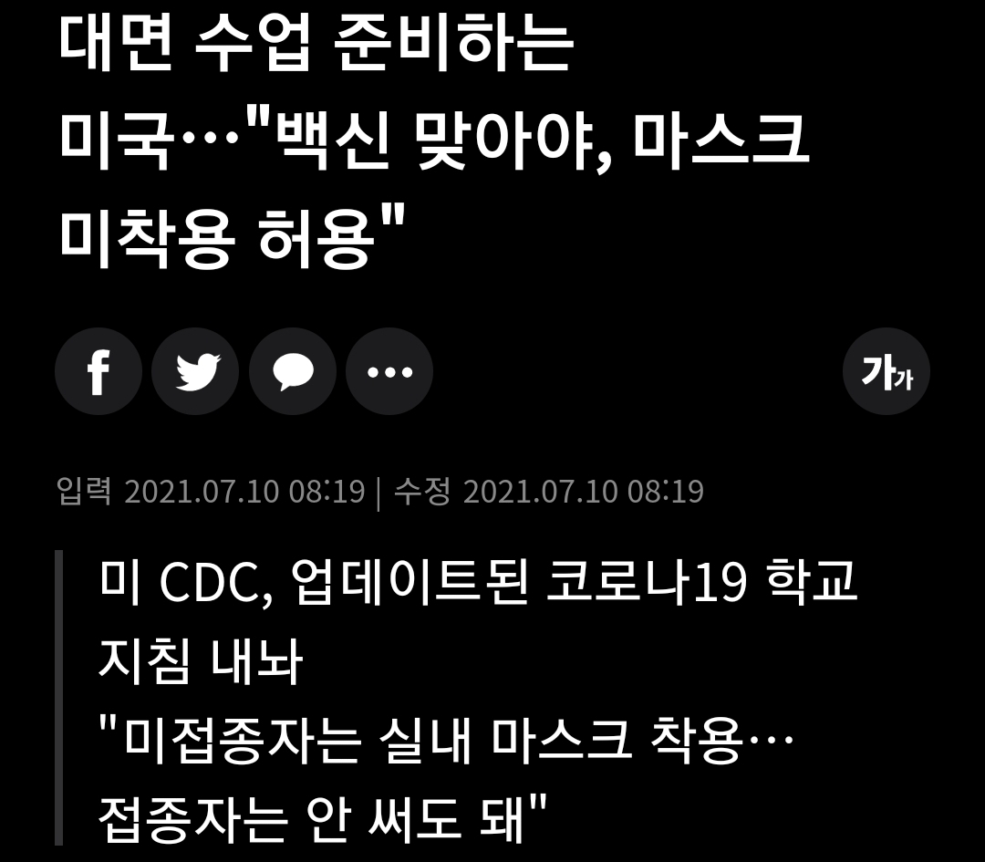 대면 수업 준비하는 미국…"백신 맞아야, 마스크 미착용 허용", 미 CDC, 업데이트된 코로나19 학교 지침 내놔 "미접종자는 실내 마스크 착용…접종자는 안 써도 돼"