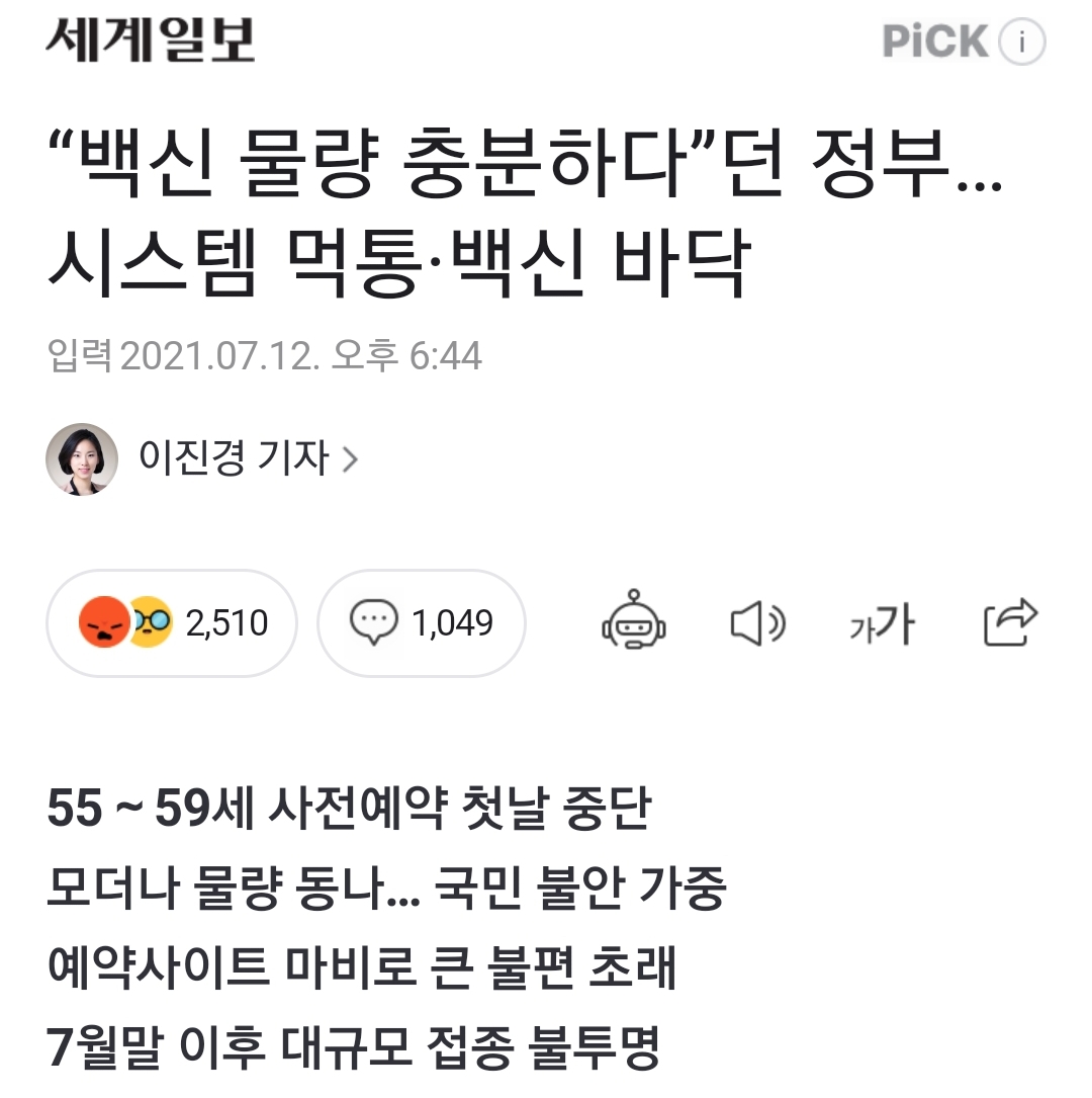 55∼59세 사전예약 첫날 중단 모더나 물량 동나… 국민 불안 가중 예약사이트 마비로 큰 불편 초래 7월말 이후 대규모 접종 불투명 12일 0시부터 만 55∼59세 대상의 코로나19 백신 접종 사전예약을
