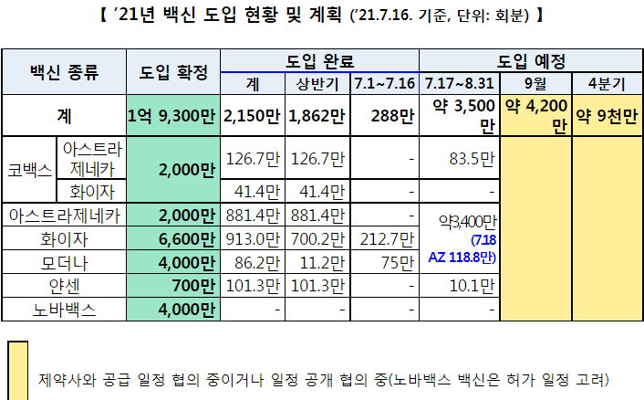 7월 하순부터 8월 말까지 사이에 3500만 도스를 들여올 계획이 잡혀 있습니다. 이게 다 들어온다면 추석 전까지 전국민이 한 번 정도는 맞을 수 있겠죠. 돌파감염을 피하려면 면역형성기간을 고려해 추석 연휴의 3~4주 전에 전국민접종을 한 바퀴 도는 게 좋을테니, 지난달과 이달 도입지연이 좀 뼈아프네요. 통계상 집단면역형성은 7할 이상이 맞으면 선언할 수 있겠지만 요즘 변이주가 계속 늘어서 그건 좀 불안할 수 있습니다.