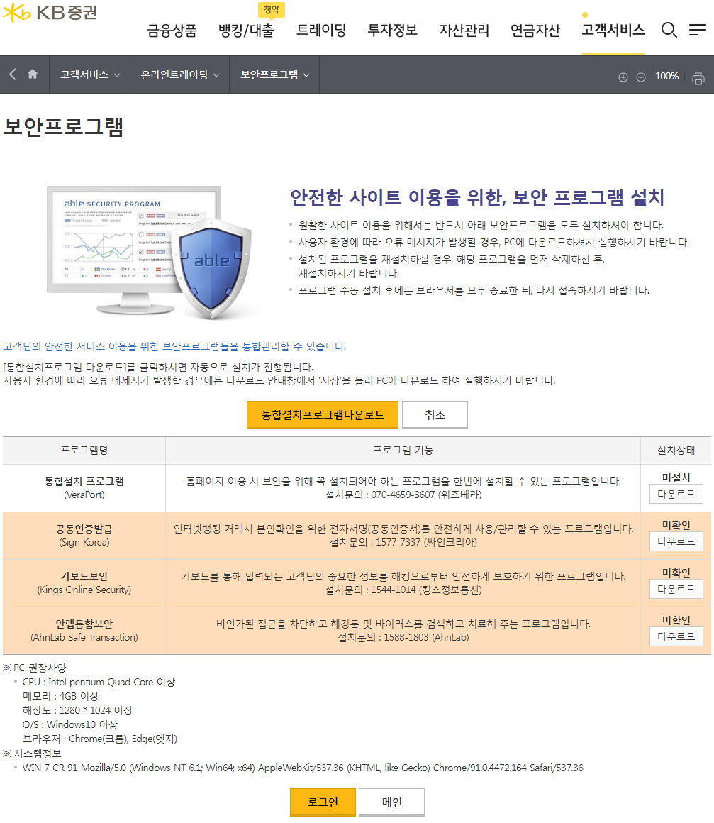 모 증권사의 공동인증서 발급시 설치해야 하는 프로그램 본문