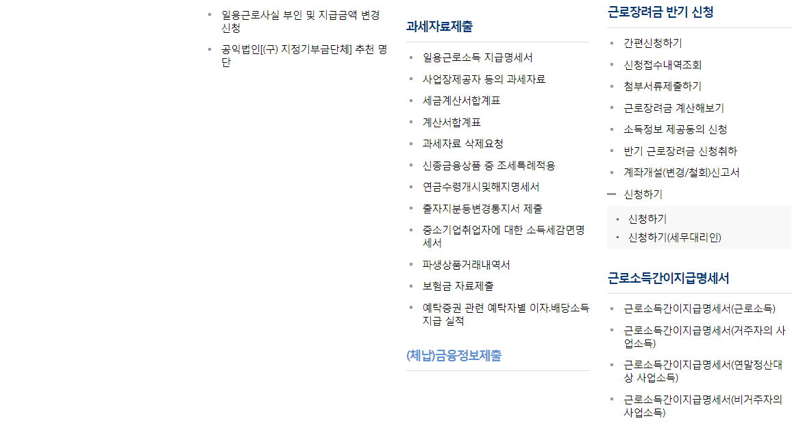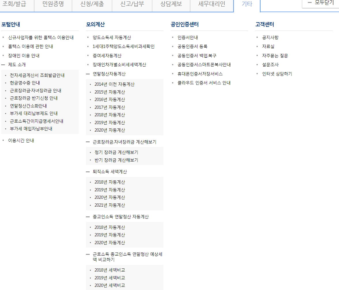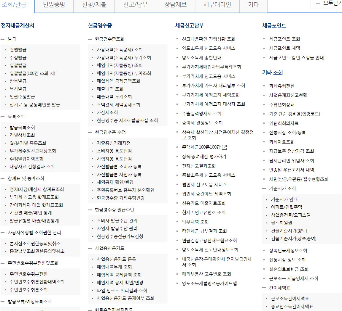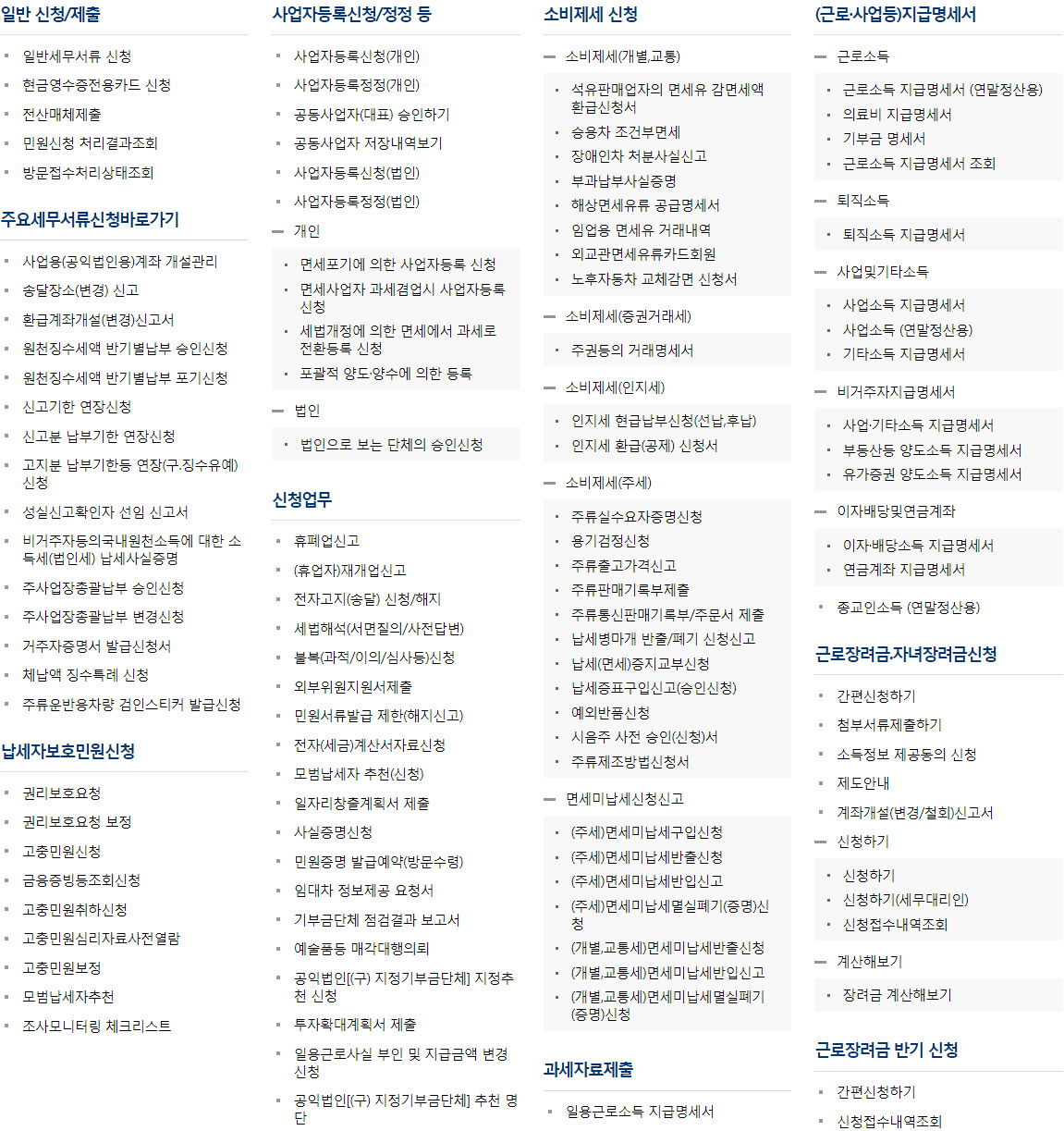 국세청 홈택스(HomeTax)사이트 스크린샷(2021.7)과 처리업무 메뉴 본문