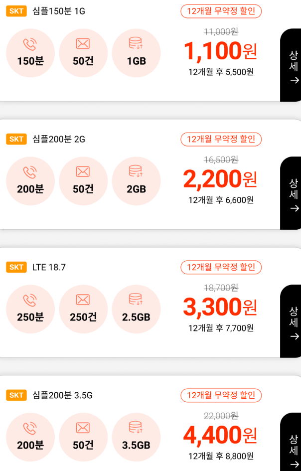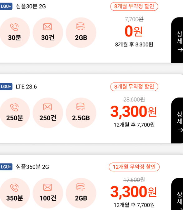 * 특가요금제는 위와 같이 "**개월 무약정 할인"이라고 적혀 있는데, 이것은 OO개월동안 해당 특가할인으로 요금을 청구하고 그 기간이 지나면 그 밑에 표시된 요금으로 청구한다는 뜻입니다. 무약정이니 OO개월을 채우기 전에 번호이동해 나갈 수도 있지만 보통 만 3개월 남짓은 있는 게 관행인지 룰인지 그렇습니다.