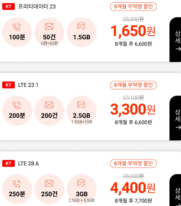 주의해볼 점은 문자메시지 기본제공인 요금제의 경우 SMS, LMS, MMS 어느 정도까지인지입니다. 그리고 어느 망이냐에 따라 유료 부가서비스에 데이터와 통화량 추가가 되는 게 있습니다. 그 경우 일할 정산이니 월중 가입, 해지할 때는 계산 필요. 모든 통신요금제가 그렇듯이 월중 해지, 번호이동해나갈 때는 할인적용계산을 확실히 해야 하며, 이건 해당 통신사 고객센터에 걸어 확인하는 것이 제일 정확합니다.