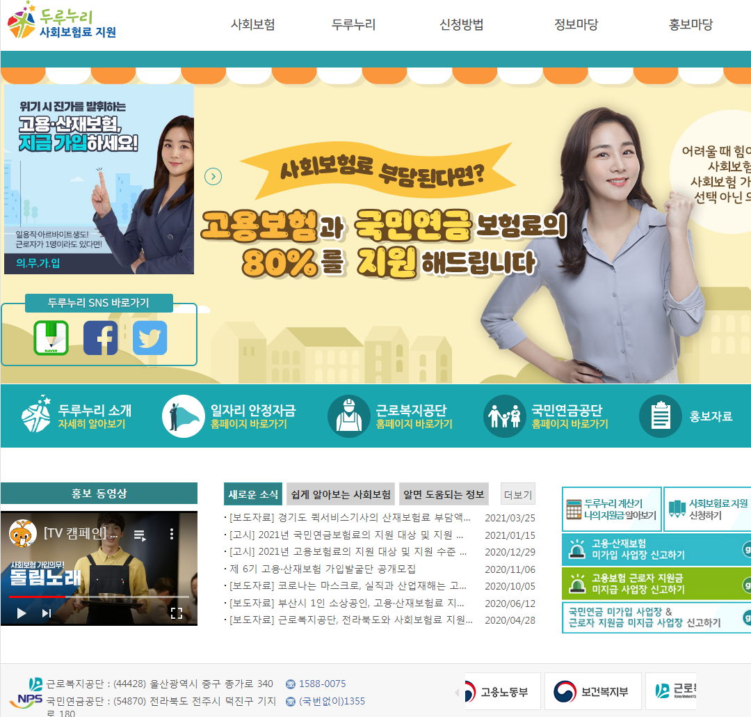 (근로복지공단, 국민연금공단) 두루누리 사회보험료지원사이트 본문
