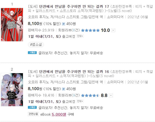 yes24.com에서 16권과 17권 신간 무료배송 중입니다. 15권쯤에서 본편과 외전을 일단락한 다음 작가가 휴식기를 가졌는데, 그게 좀 길다 보니 독자들도 좀 식어서 다시 불붙이려고 애쓴다는 느낌이네요. 하긴 저도 본편 15권 분량까지는 본편과 함께 외전인 소드 오라토리아, 파밀리아 크로니클 시리즈, 그리고 에피소드 류의 만화판까지 전자책을 다 샀는데, 그 뒤로는 아직입니다. 다음 권이 나올 때쯤 그리고 소드 오라토리아도 새로 불당기면 또 달려봐야겠네요. ^^