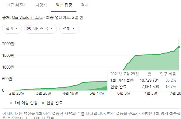 어느 백신 1번이라도 맞은 사람 1900만 명 돌파. 전국민의 36%를 넘었습니다.