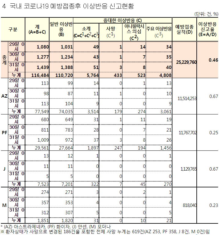 약 4천건당 1명이 중대한 이상반응신고접수함. 약 6만건당 1명이 이상반응(부작용) 사망접수함.5